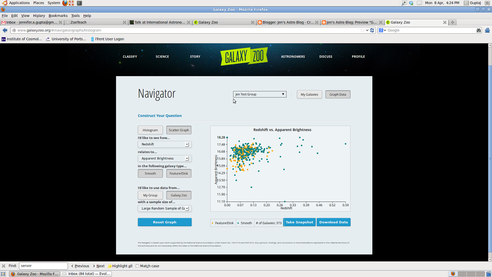The most exciting part of Navigator for me is the ability to easily investigate your galaxies in more detail. There is the option to plot a histogram or a scatter graph and there are five parameters you can play with: redshift, colour, apparent brightness, absolute radius and absolute brightness. You then choose smooth or feature/disk galaxies, a small, medium or large sample size and whether you want to use your galaxies or a random selection of galaxies from Galaxy Zoo. You can also download the data if you want to make your own graphs. There are a few screenshots below showing examples of the different kinds of plots you can create but if you’re interested then I would recommend spending a bit of time on the Navigator yourself to get a feel for it. I personally think the Navigator is going to be really useful for schools outreach and I’m looking forward to trying it out with a group of students in a few weeks.